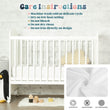 A white crib stands against a light brick wall with care instructions displayed above it. The personalized text includes details for cold wash, low-heat drying, no bleaching, dry cleaning, or ironing on the design. Icons emphasize the blanket's softness, washability, and anti-tarnish materials—ideal for your personalized baby blessing needs with our Customized Newborn Name Blanket.