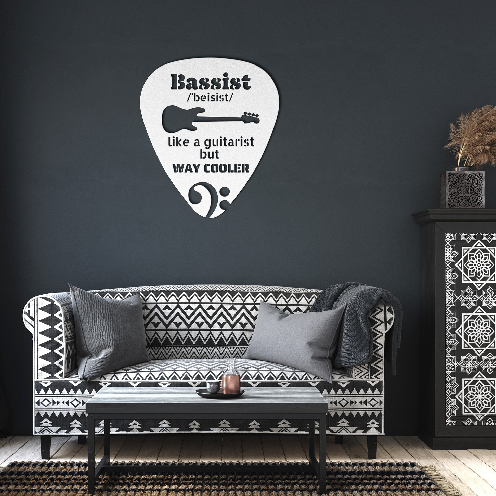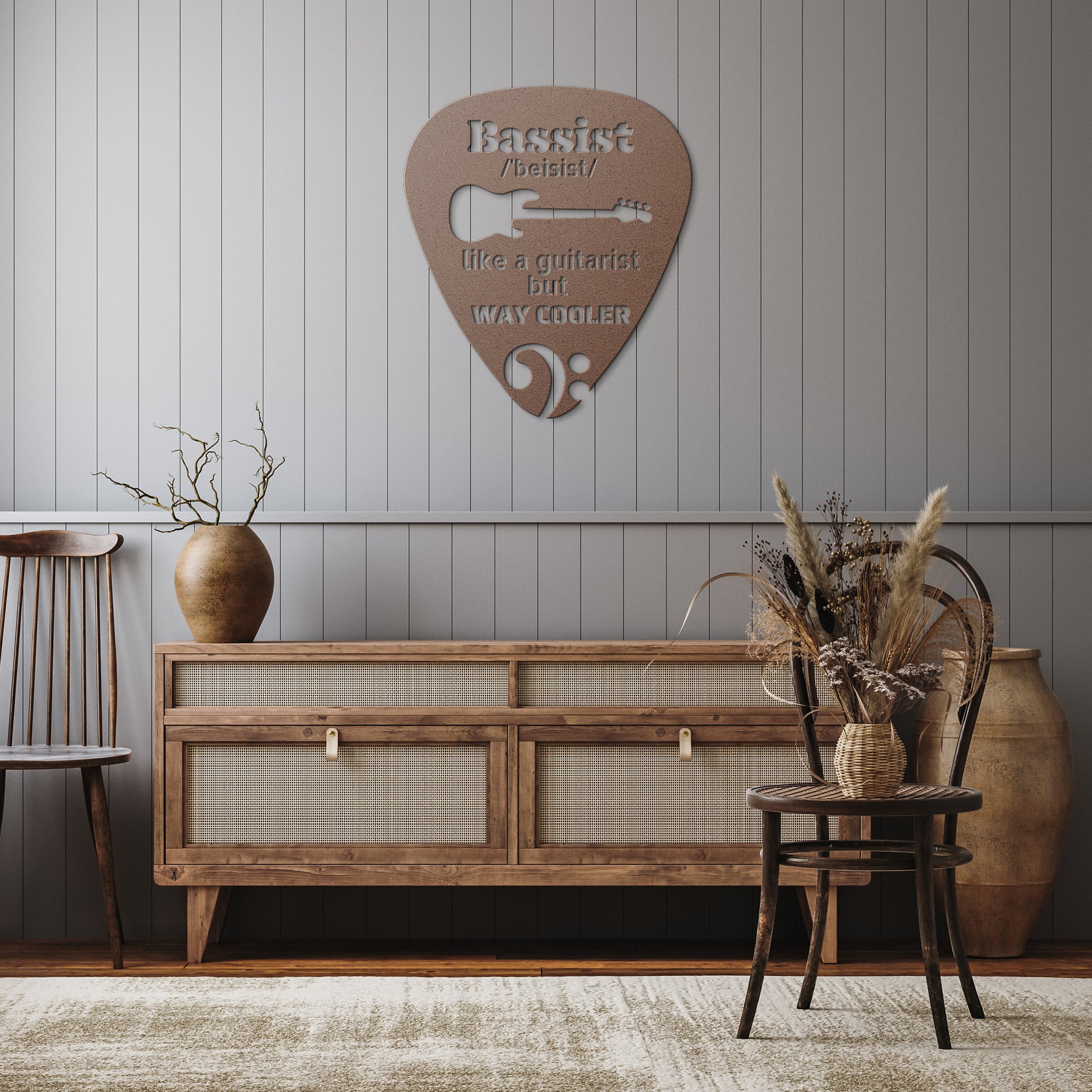 Unlock your creative side and level up your décor with the metal wall art to define a true bassist. This stylish artwork is the perfect way to showcase your love of music in any room. Crafted from high-quality metal, our metal wall art has been cut into the shape of a guitar pick to provide a unique, one-of-a-kind look.